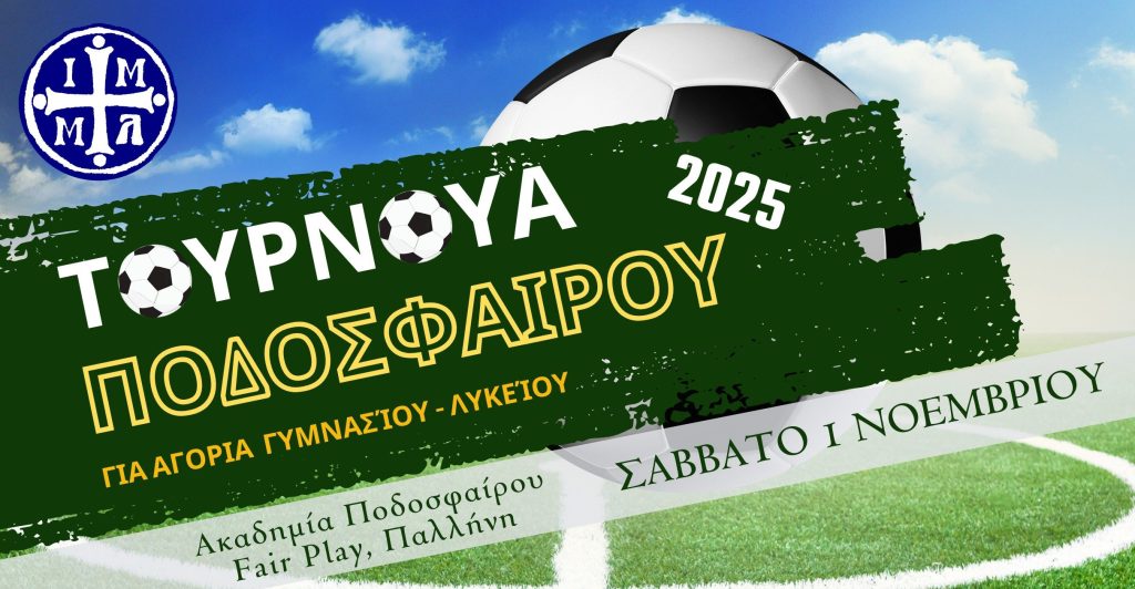 Στο πλαίσιο της προσπάθειας της Ιεράς Μητροπόλεως Μεσογαίας & Λαυρεωτικής για καλύτερη ποιμαντική προσέγγιση των μαθητών μεγαλύτερης ηλικίας (Γυμνασίου & Λυκείου), το Γραφείο Νεότητας διοργανώνει Δ΄ ΕΤΗΣΙΟ ΤΟΥΡΝΟΥΑ ΠΟΔΟΣΦΑΙΡΟΥ μεταξύ των αγοριών ΓΥΜΝΑΣΙΟΥ-ΛΥΚΕΙΟΥ των κατηχητικών μας.