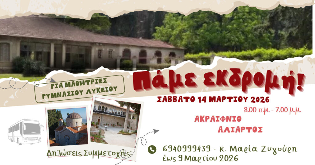 Η εκδρομή θα πραγματοποιηθεί, συν Θεώ, το Σάββατο 14 Μαρτίου 2026 και θα περιλαμβάνει Προσκύνημα στην Ι. Μονή Γενεθλίου της Θεοτόκου στο Ακραίφνιο, περίπατο μέχρι το Παρεκκλήσι του Αγίου Αλεξίου, οργανωμένο παιχνίδι στη φύση, γεύμα σε τοπικό εστιατόριο, βόλτα στους κήπους της Αλιάρτου.
