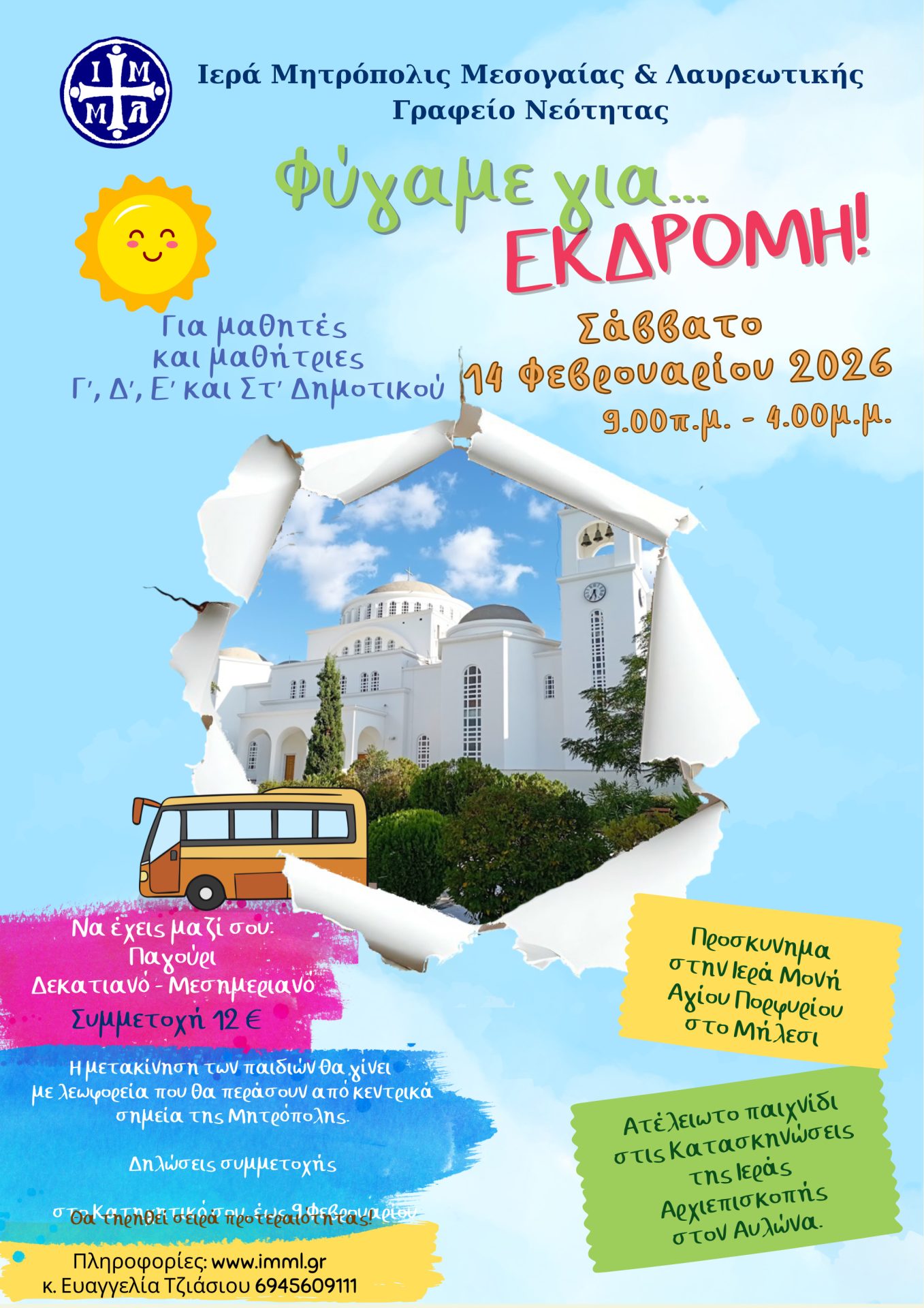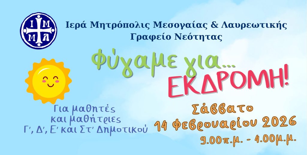 Με χαρά σας ενημερώνουμε ότι, στα πλαίσια της προσπάθειας της Ιεράς Μητροπόλεως Μεσογαίας & Λαυρεωτικής για καλύτερη ποιμαντική προσέγγιση των μικρότερων σε ηλικία μαθητών και μαθητριών Δημοτικού, το Γραφείο Νεότητας διοργανώνει Εκδρομή για παιδιά ΔΗΜΟΤΙΚΟΥ (Γ΄, Δ΄, Ε΄ και Στ’ τάξης) των κατηχητικών μας.