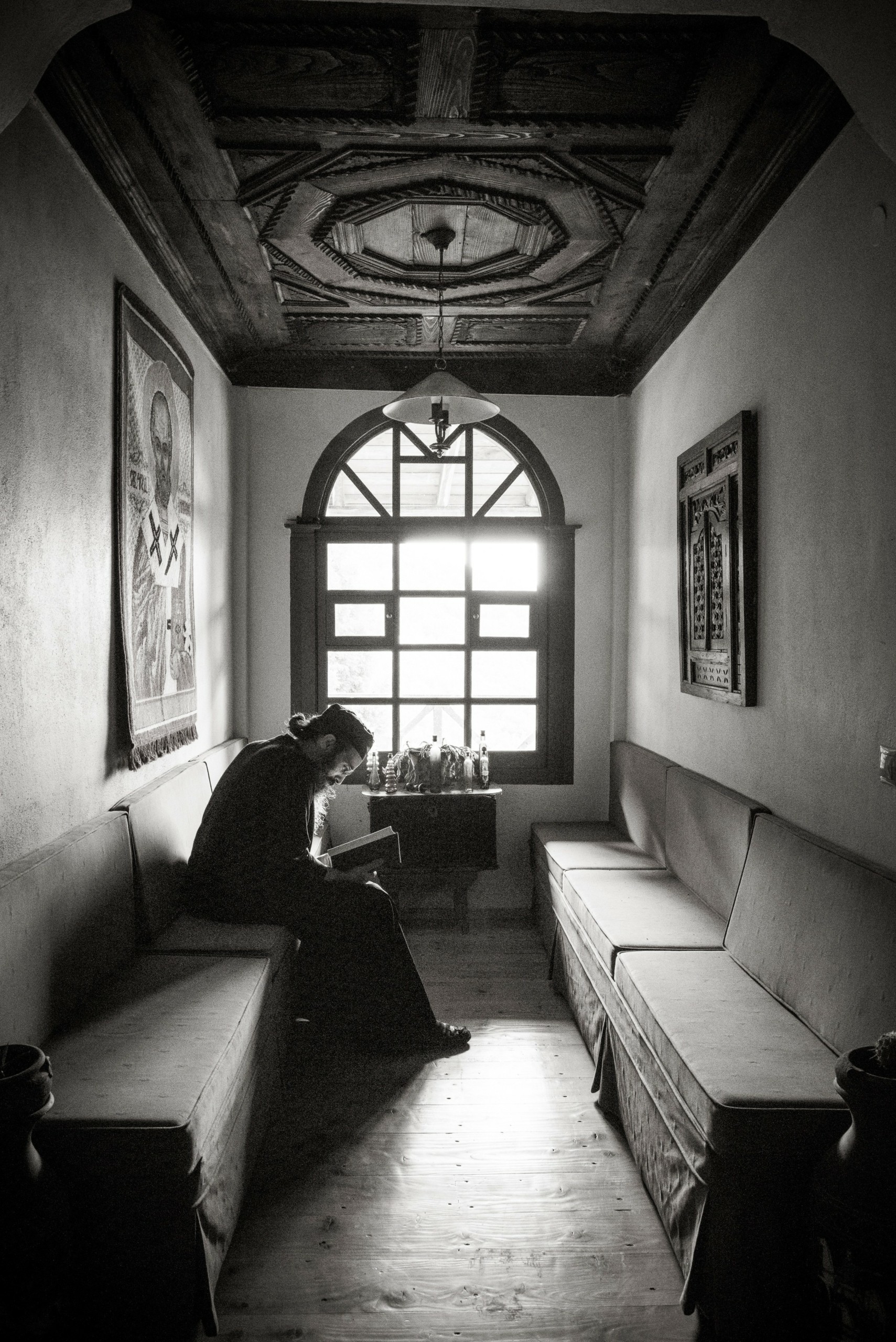 Προς το τέλος της «Αθωνικής θητείας» μου και με εφαλτήριο την πραγματικά πανέμορφη μονή Σίμωνος Πέτρας, που, κυριολεκτικά, κρέμεται σε ύψος 300 μέτρων από τη θάλασσα, πάνω σε βράχο από γρανίτη, είχα την ευκαιρία όχι μόνο να ταξιδέψω σε πολλά και διαφορετικά τοπία, μονές, σκήτες και κελιά μοναχών, αλλά και να συνομιλήσω με πολλούς μοναχούς. Με δύο πραγματικά αξιόλογους «πατέρες», όπως αποκαλούνται οι μοναχοί από εμάς τους «λαϊκούς», τριγυρνούσαμε πολλές Κυριακές, από το πρωί ως την δύση του ηλίου, που κλείνουν οι μεγάλες πόρτες των μοναστηριών. Από κελιά-βιβλιοδετεία που ‘τρέχαν να μας καλωσορίσουν μέχρι τη Μονή Εσφιγμένου, που προς μεγάλη μας έκπληξη, απαγόρευσαν στους πατέρες που μας συνόδευαν να μπουν στο ναό της μονής. Από την πανήγυρη της Μονής Μεγίστης Λαύρας με τα τεράστια καζάνια, ως τα αμπέλια στον Μυλοπόταμο με το πιο γλυκόπιοτο κρασί. Από τον φωτεινό και γελαστό αρχοντάρη της Σκήτης του Προφήτη Ηλία και την γλυκιά μονή Παντοκράτορα ως την αυστηρότητα του Πρωτάτο. Από την μικρή, ήσυχη Σταυρονικήτα ως την τεράστια, σαν μικρό χωριό, εξελιγμένη μονή Βατοπεδίου. Κατανοώντας την δίψα μου για την απεικόνιση όλων αυτών των εμπειριών, οι πατέρες βοήθησαν να υλοποιηθεί αυτή η επιθυμία μου. «Πριν φύγεις από εδώ πρέπει να έχεις γεμάτο οπτικό υλικό». Έτσι κι έγινε. Κατά το ήμισυ, βέβαια, αφού έχω αφήσει ένα δύσκολο κομμάτι, για το μέλλον.