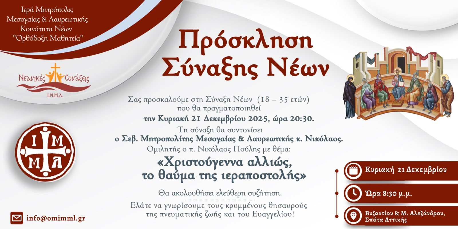Σας προσκαλούμε στην Σύναξη Νέων (18-35 ετών) που θα πραγματοποιηθεί